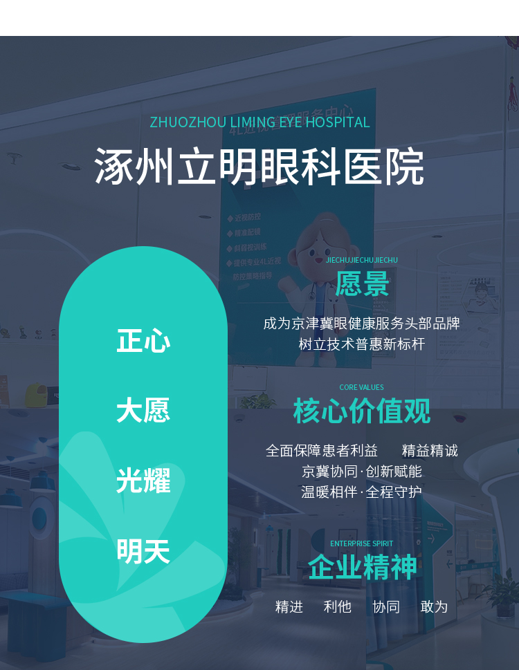 涿州立明眼科医院于2014年扎根涿州市华阳西路69号,5000余㎡医疗空间,承载着守护眼健康的使命。我们秉持 “正心 大愿 光耀 明天” 文化理念,搭建眼健康守护平台。引进国际杰出检查诊疗设备,汇聚全国知名眼科专家,11年来服务几十万患者 。以专业诊疗思维、贴心服务温度与舒适就医环境,覆盖屈光矫正、白内障诊疗等多元需求,助力患者守护清晰 “视” 界。2021年增设独立中医诊区,借针灸通络、中药调理等传统疗法,呼应中医药医疗保健需求,让中医智慧融入眼健康守护。从近视矫正到白内障干预,从西医精准诊疗到中医特色调理,我们持续为患者重塑清晰视界、重拾眼部健康活力,做您身边值得托付的眼健康守护者 。